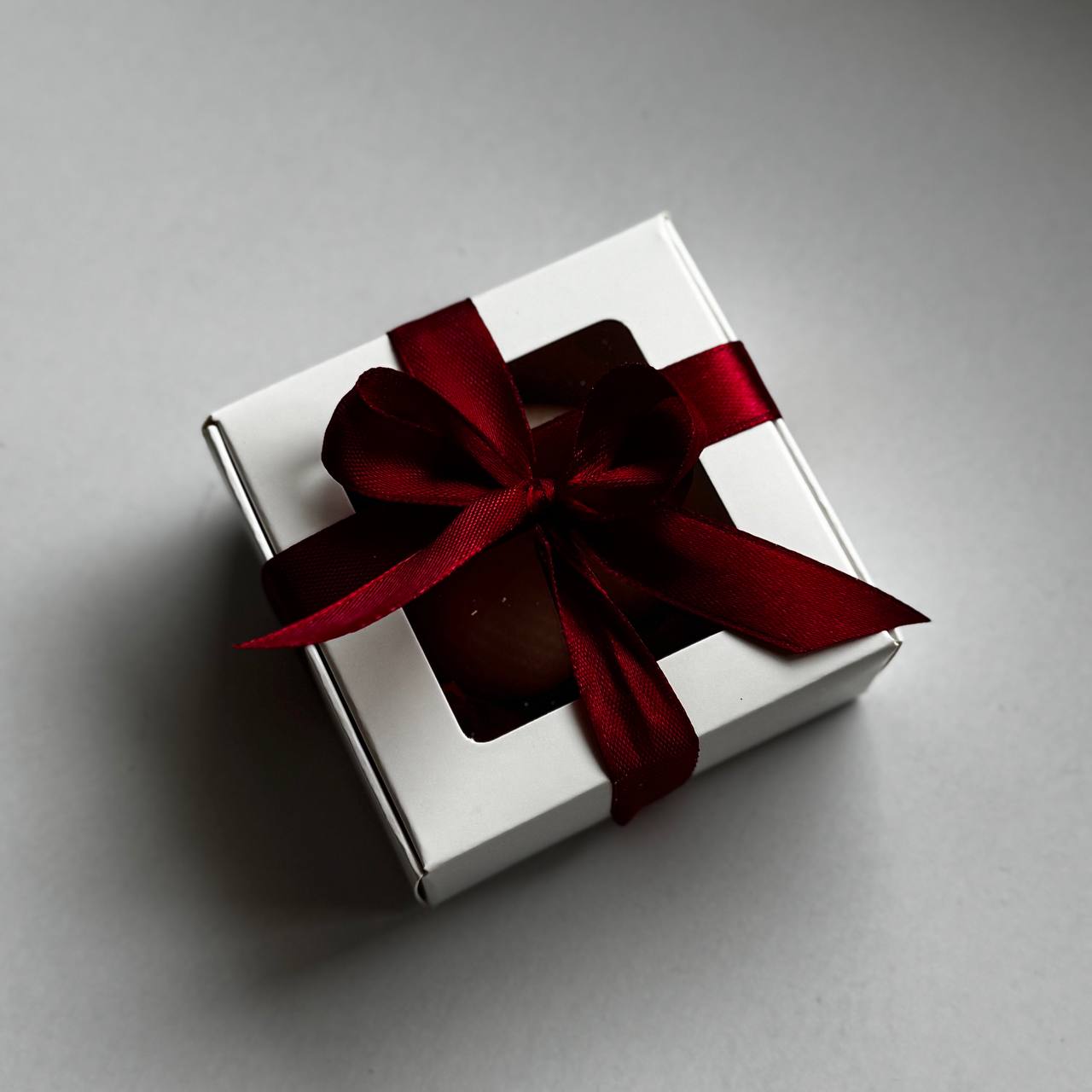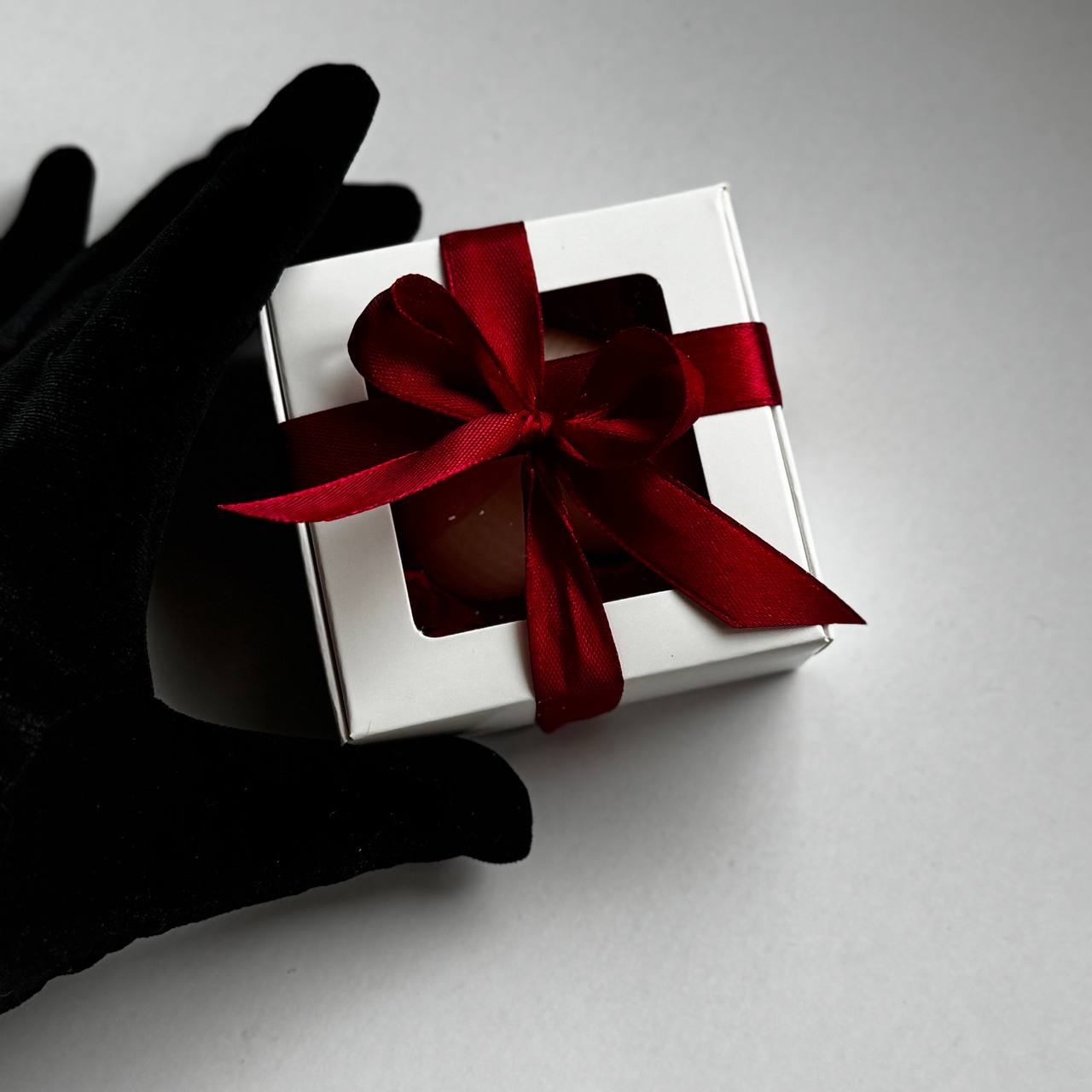 Świeca zapakowana jest w eleganckie białe pudełeczko i przewiązana czerwoną wstążką — gotowa, by stać się cichym, ale wymownym komunikatem. To drobny prezent, który potrafi powiedzieć więcej niż długie zdania.