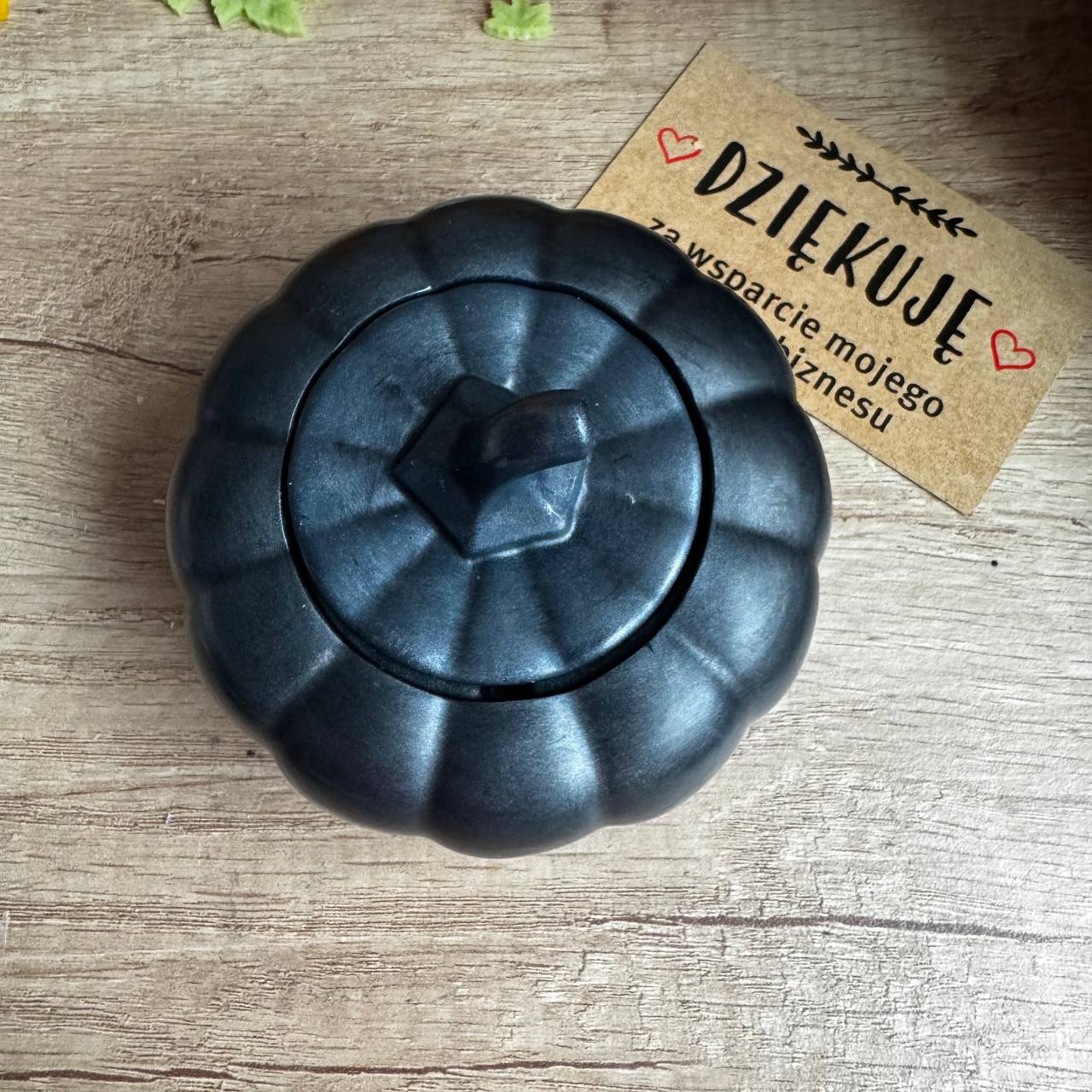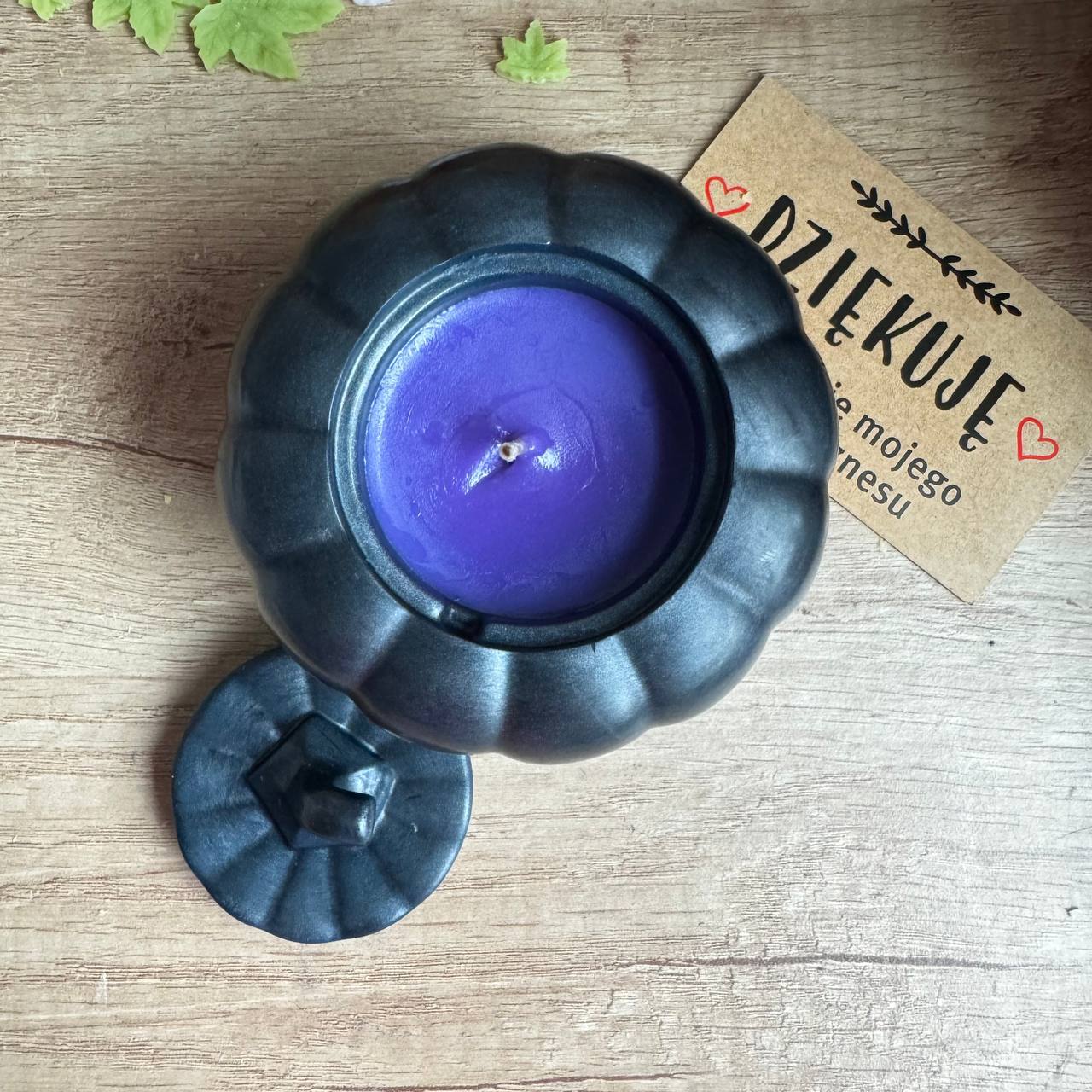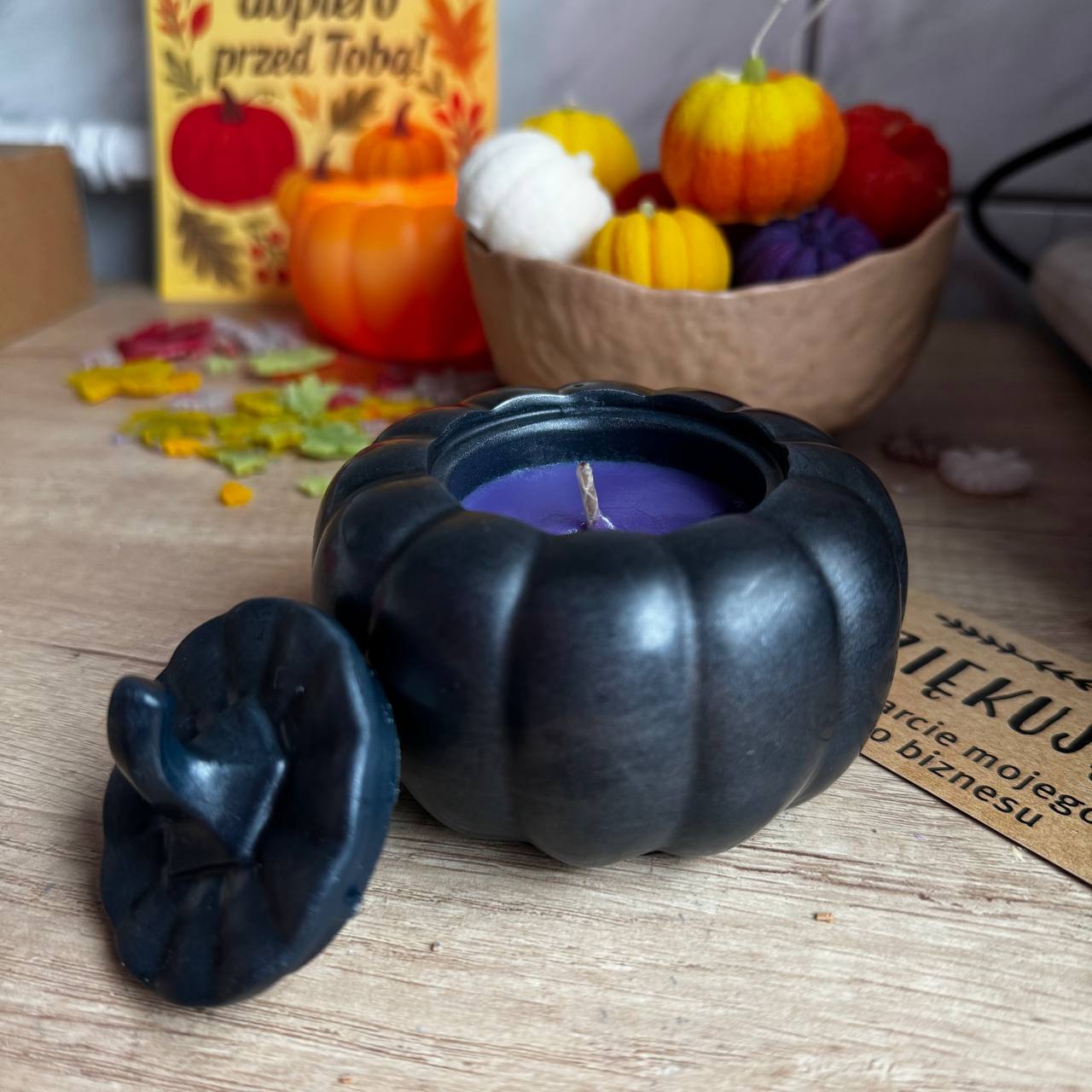 Podstawka wykonana z mieszanki twardych wosków, wypełniona woskiem sojowym. Ma delikatny zapach jesiennej dyni.