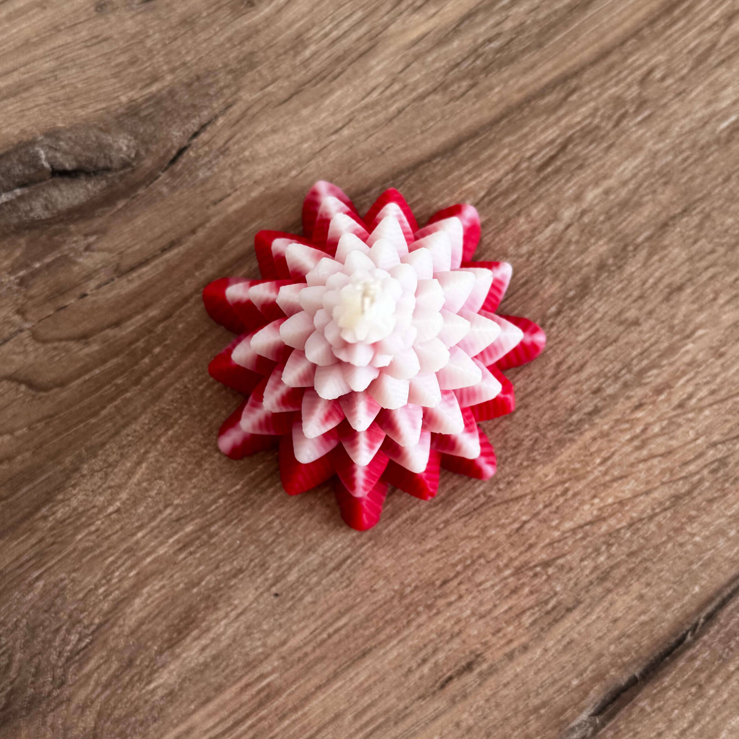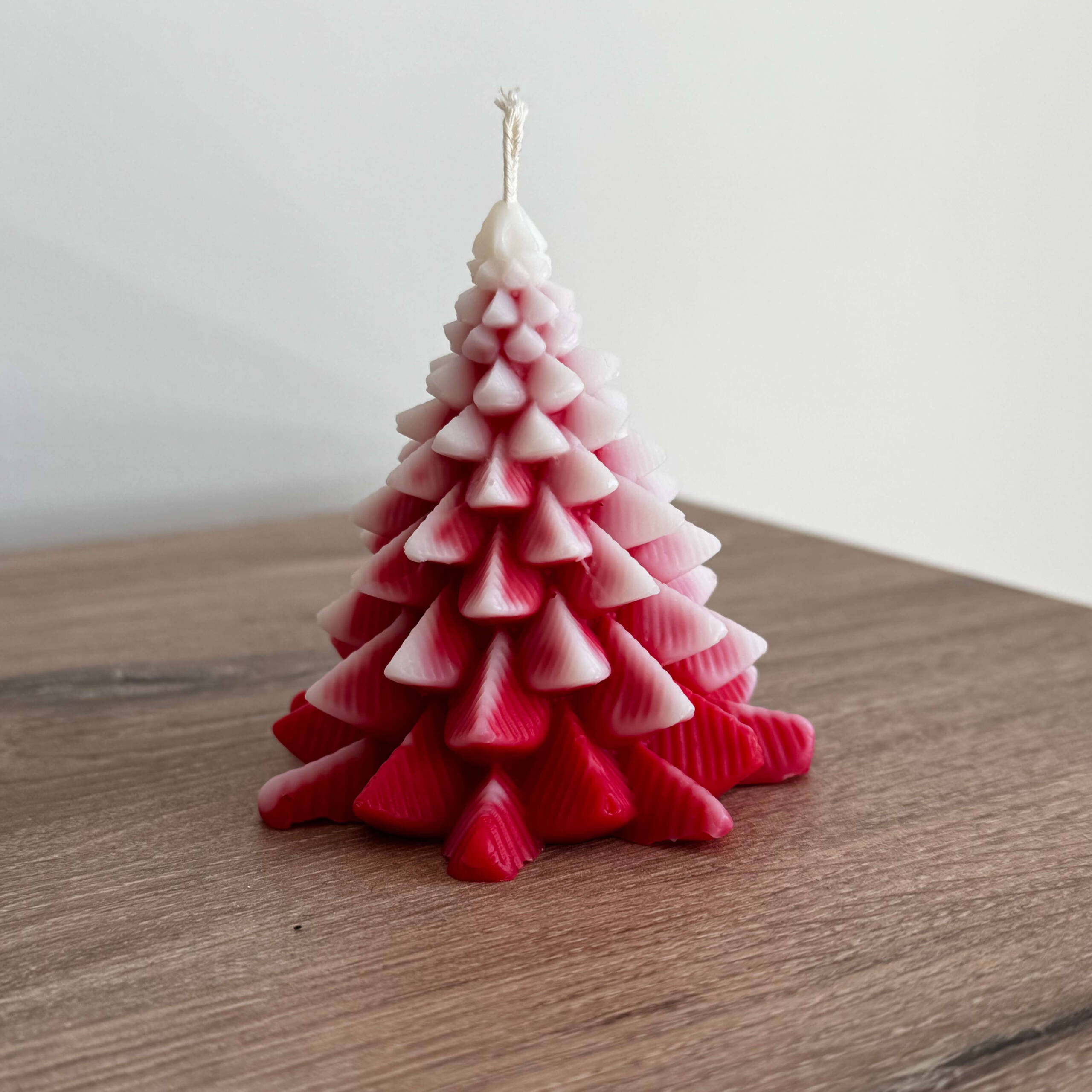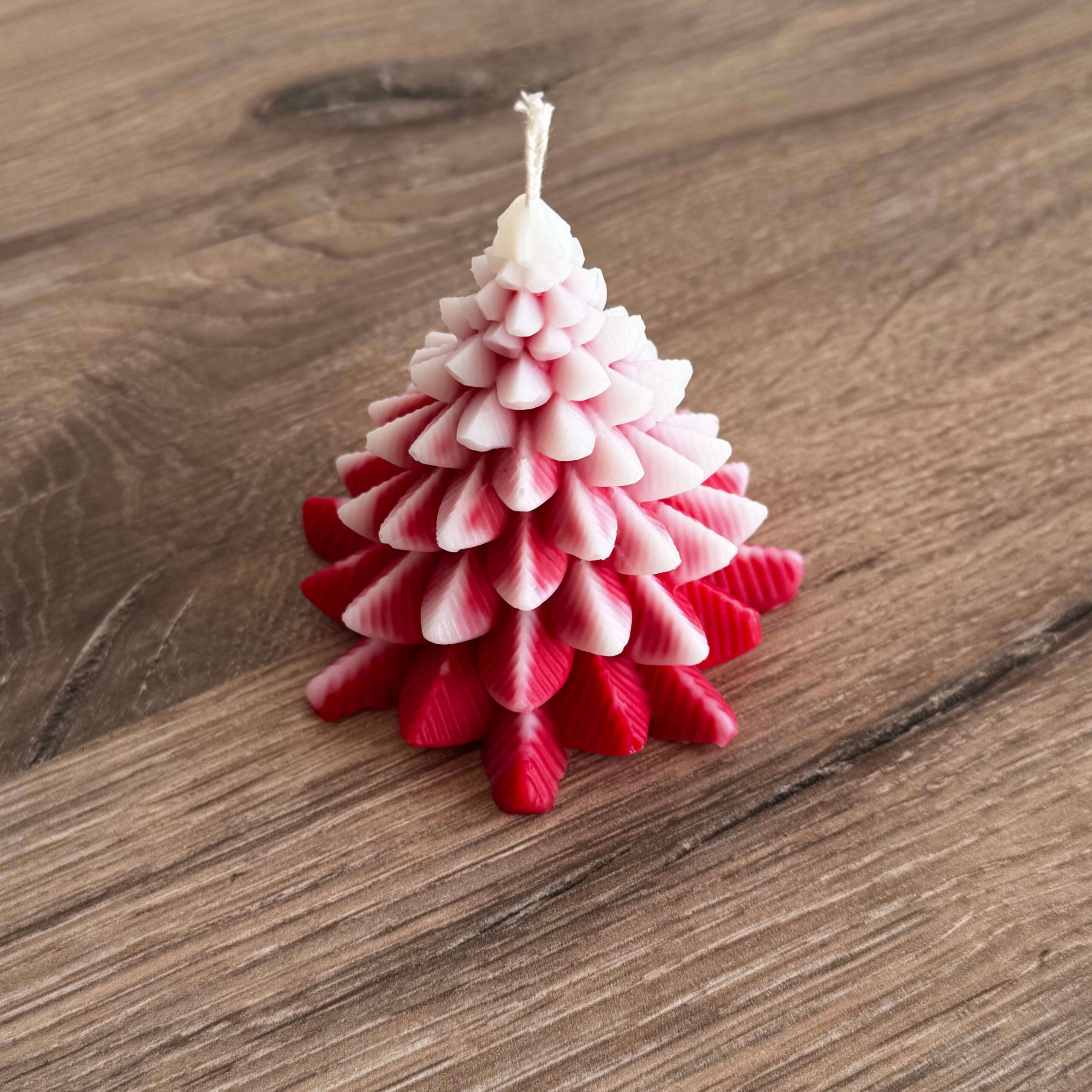 Delikatne przejście kolorów – od intensywnej czerwieni po subtelną biel – sprawia, że świeca jest nie tylko źródłem światła, ale także elegancką dekoracją świąteczną. Idealnie sprawdzi się jako ozdoba wnętrza oraz prezent na Boże Narodzenie czy Nowy Rok.