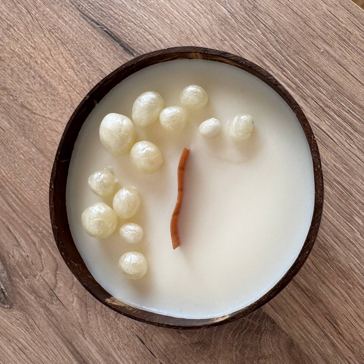 Naturalny wosk, kokosowa forma i ukryta perła – jak mały skarb, który odkrywasz przy każdym odpaleniu. Perły zostały wykonane z wosku pszczelego. Sama świeca jest z wosku sojowego z drewnianym knotem.