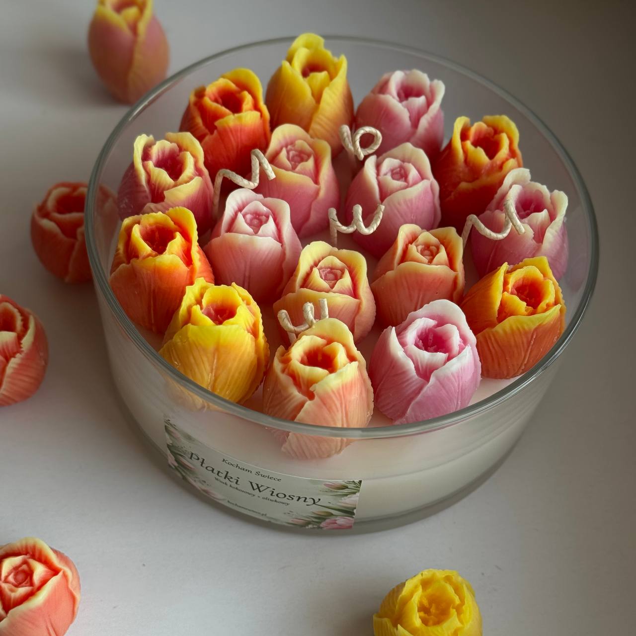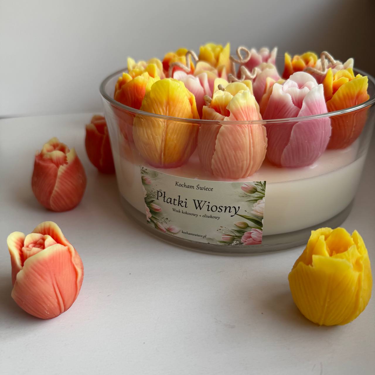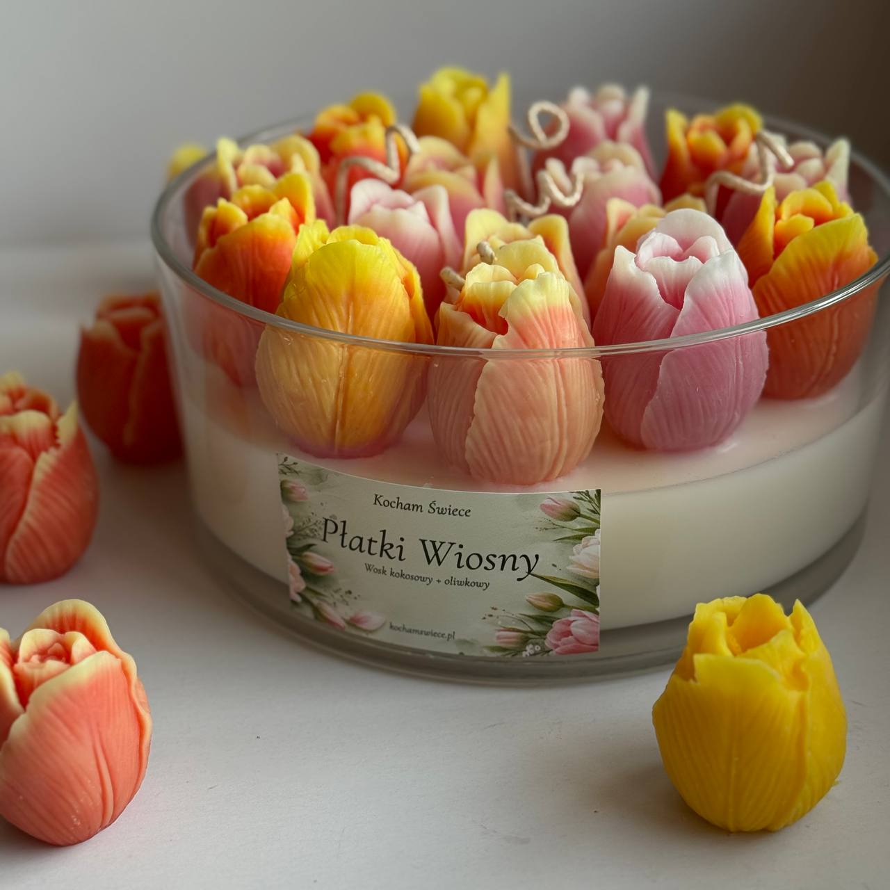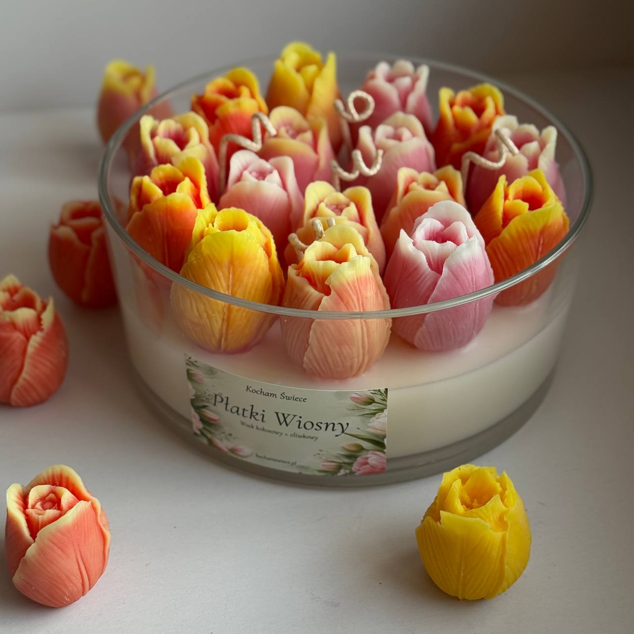 Świeca Płatki Wiosny to zapach pierwszego ciepłego poranka, gdy powietrze wypełnia delikatna słodycz kwitnących tulipanów. To kompozycja, która otula przestrzeń intensywnym, a jednocześnie świeżym aromatem – pełnym światła, lekkości i kobiecej subtelności.