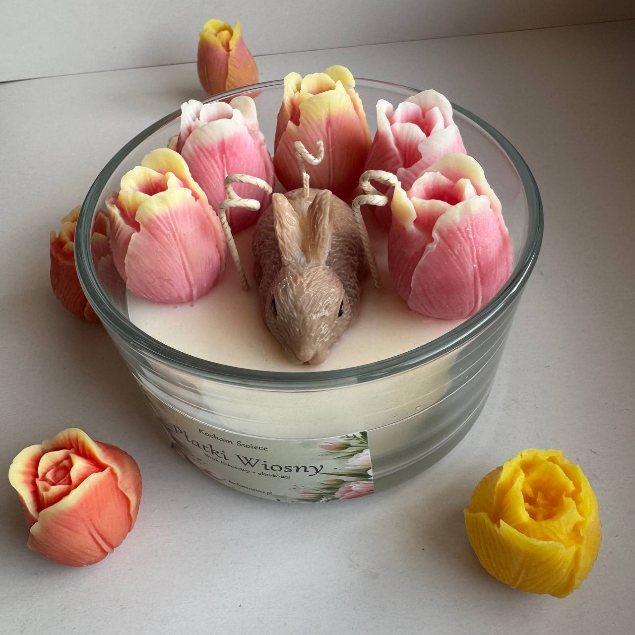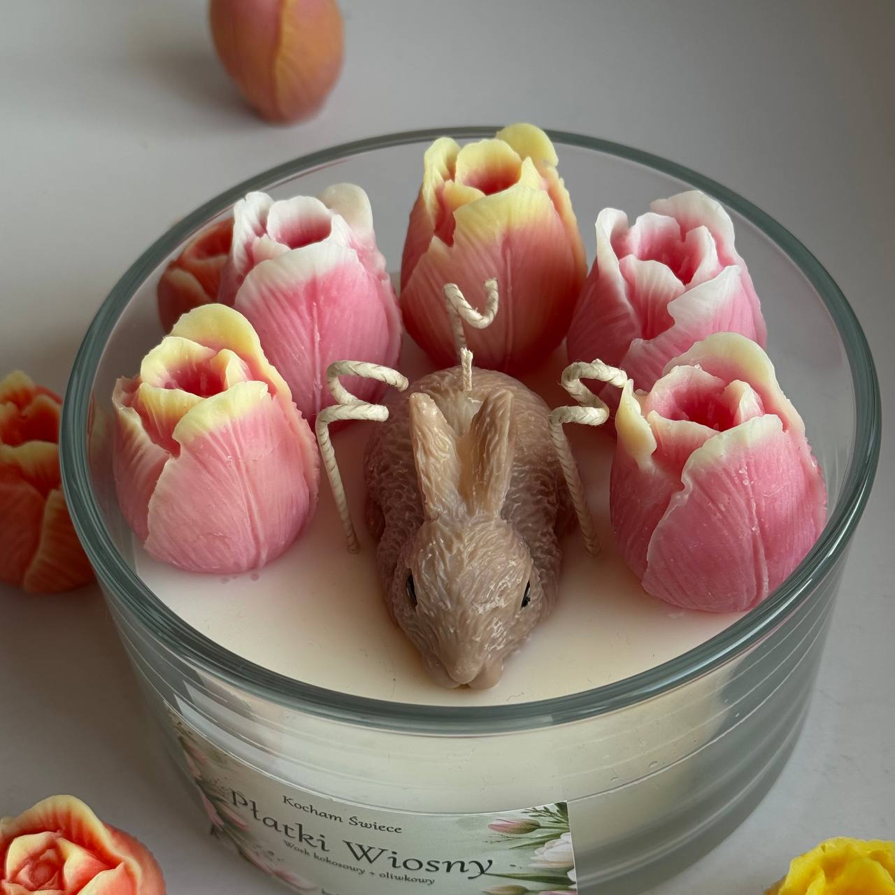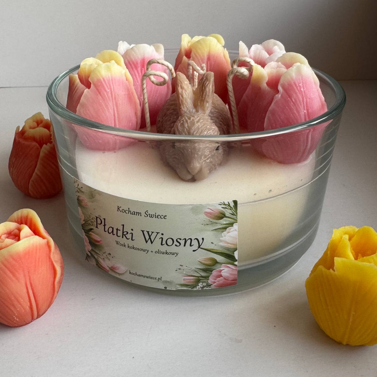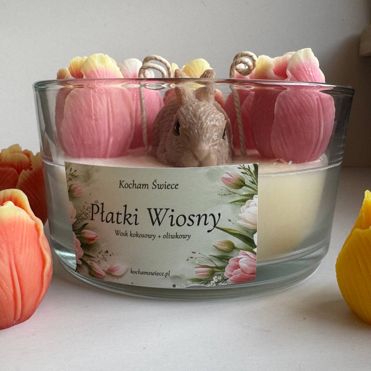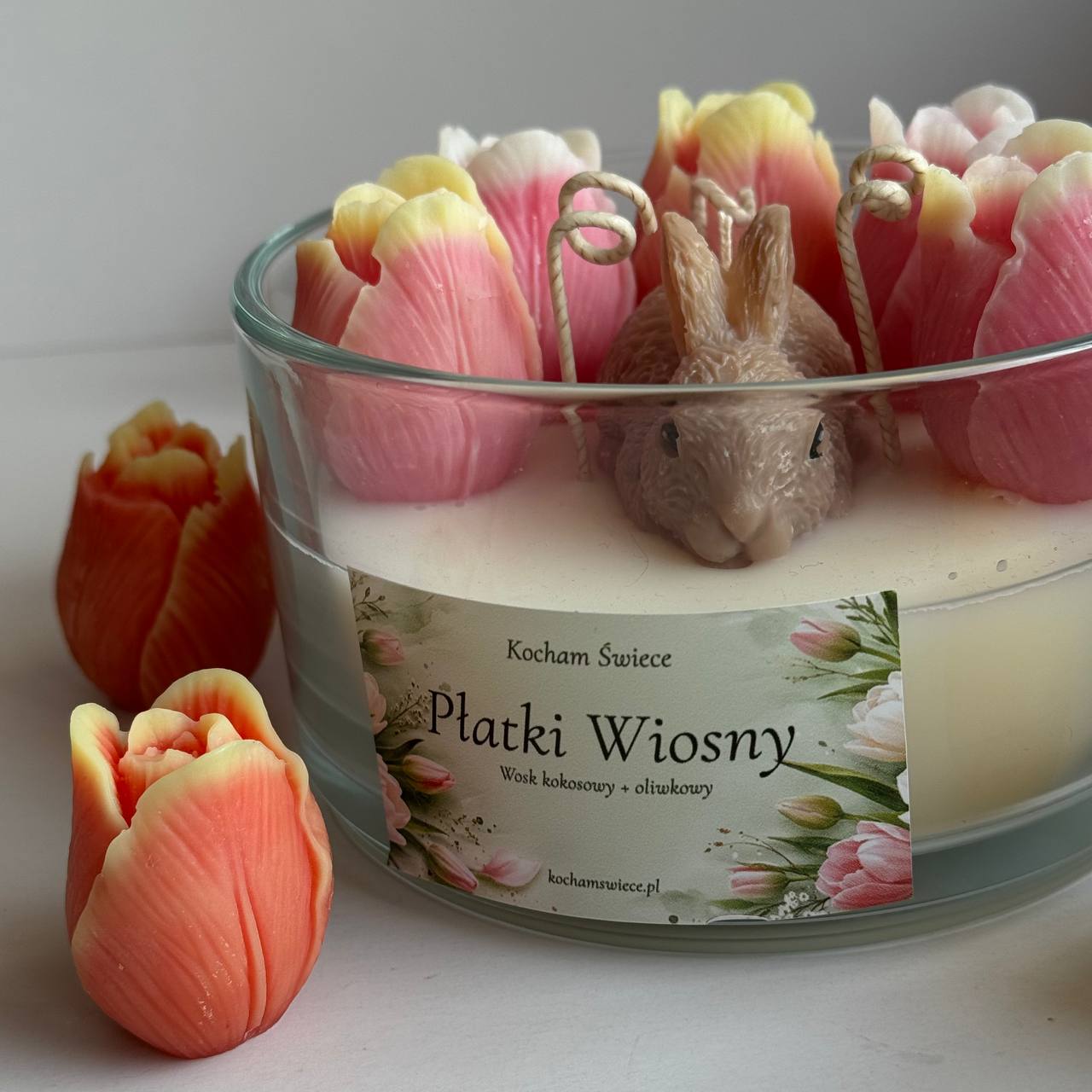 Świeca Płatki Wiosny to zapach pierwszego ciepłego poranka, gdy powietrze wypełnia delikatna słodycz kwitnących tulipanów. To kompozycja, która otula przestrzeń intensywnym, a jednocześnie świeżym aromatem – pełnym światła, lekkości i kobiecej subtelności.
